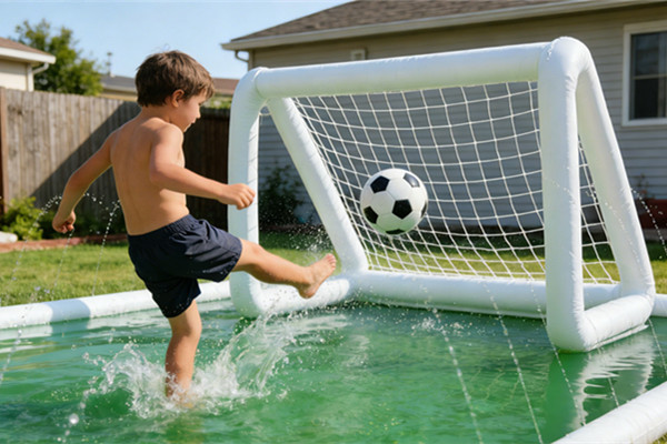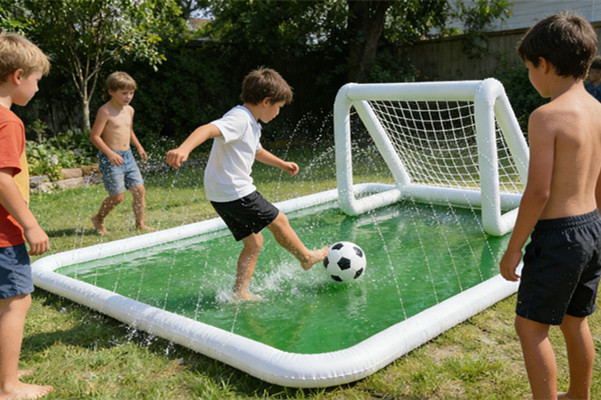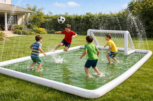 • 3-in-1 soccer splash pad: water play + soccer goal + active skill training
