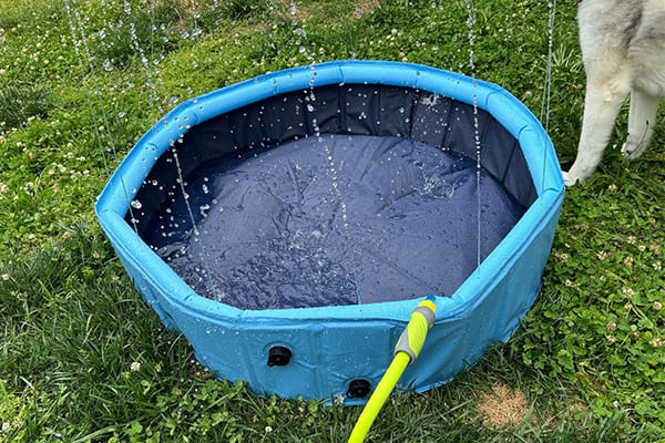 Once the hose is connected, fill the pool with water. As the water fills up, the pool will expand and create a refreshing splash zone for pets and kids to enjoy during the summer.