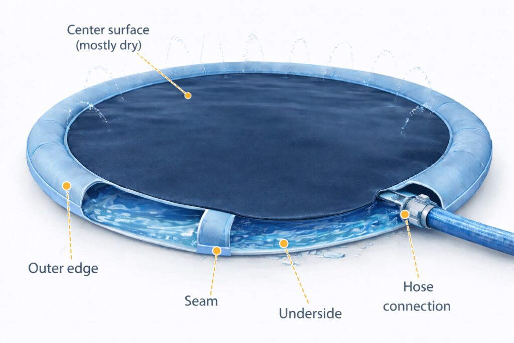 This is the first thing that causes early storage mistakes. A splash pad does not dry evenly. The flat center usually dries first because it gets the most airflow and sun exposure. The outer edge, seam lines, underside, and hose connection area usually dry last because they are thicker, less exposed, or pressed against the ground.