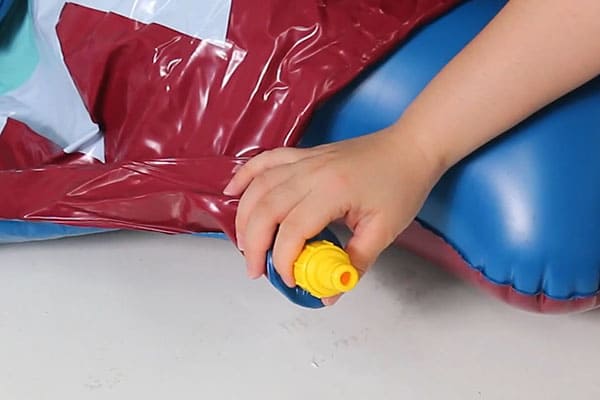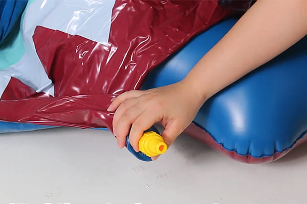Next, use the air pump nozzle to fill the top sprayer nozzle with air. Inflate until the kids sprinkler stands upright and is fully inflated, ensuring that it’s ready for the water flow.